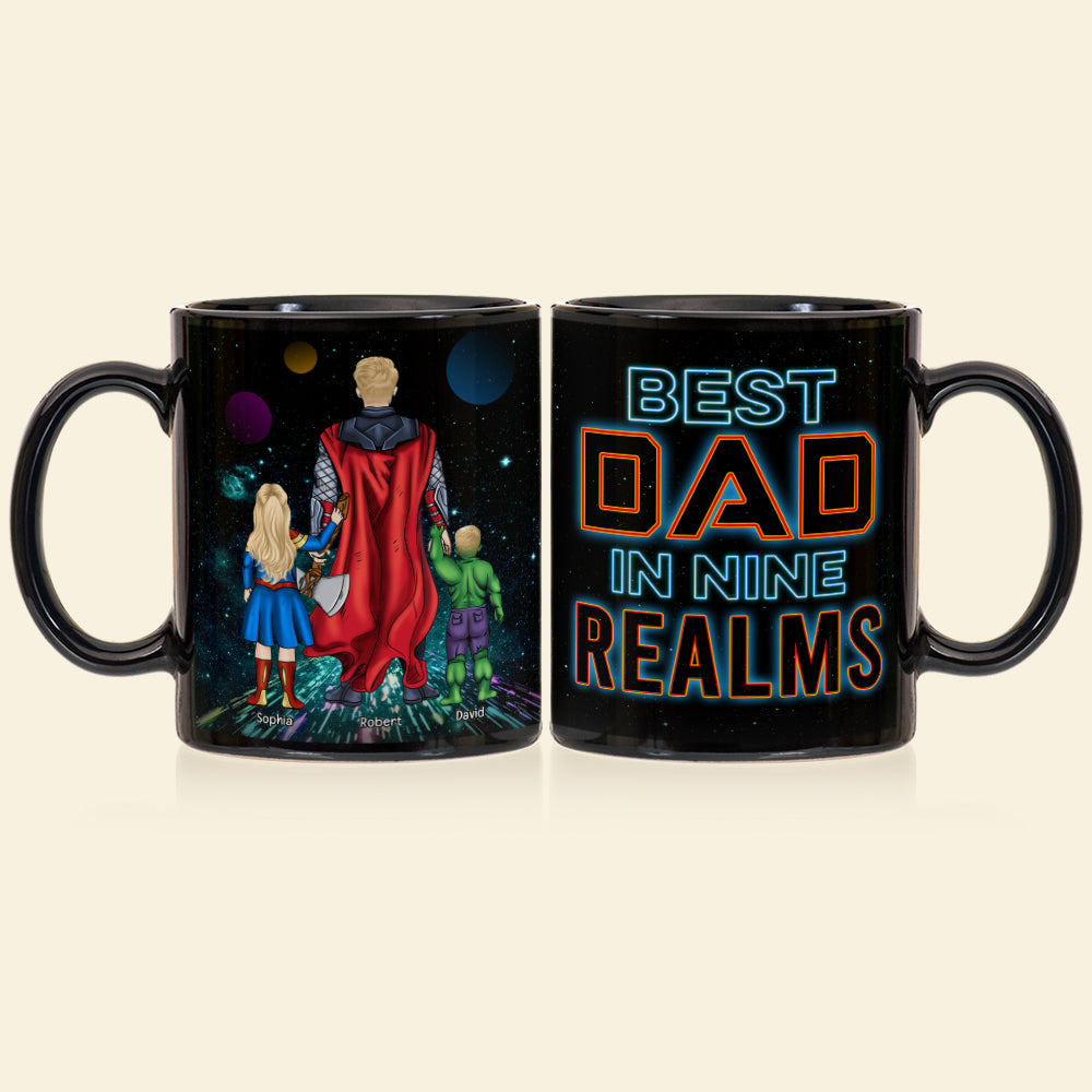 Celebrate the incredible dad in your life with our 'Best Dad in Nine Realms' Personalized Coffee Mug. Featuring a heroic design that can be customized with names, this mug is the perfect gift for Father's Day, birthdays, or any special occasion. Show your dad he's the ultimate hero in your story!