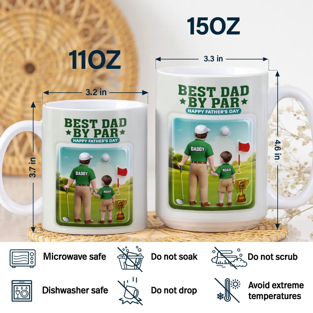 Celebrate the special bond between father and child with our 'Best Daddy By Par' personalized mug. Featuring a charming 3D design that highlights iconic moments on the golf course, this mug makes the perfect gift for Father's Day. Customizable with names, it's not just a mug; it's a keepsake that brings smiles to dads and grandpas alike. Make every sip memorable!