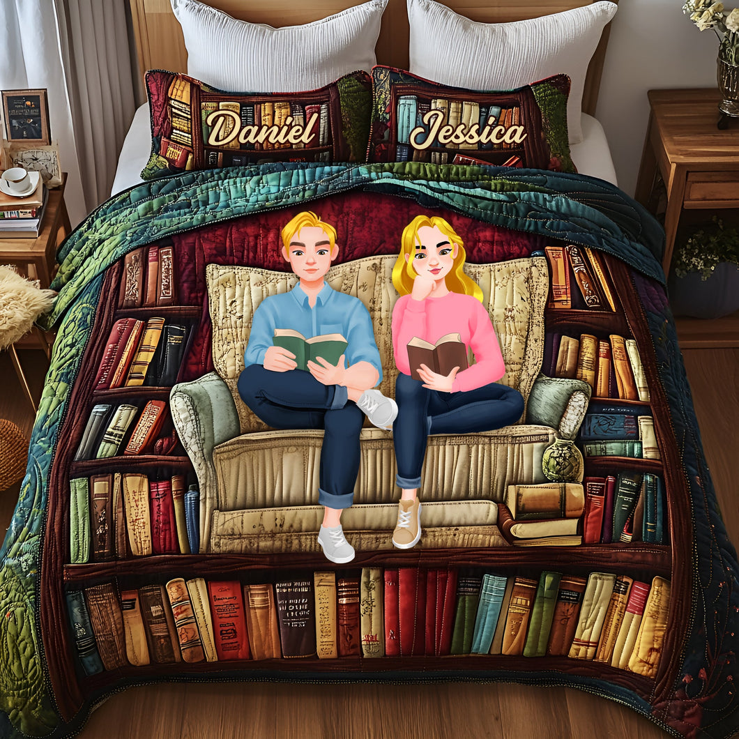 "Immerse in Your Story Together: Bookish Couple Quilt Bedding Set - Personalized Gift for Couples, Readers, and Book Lovers"