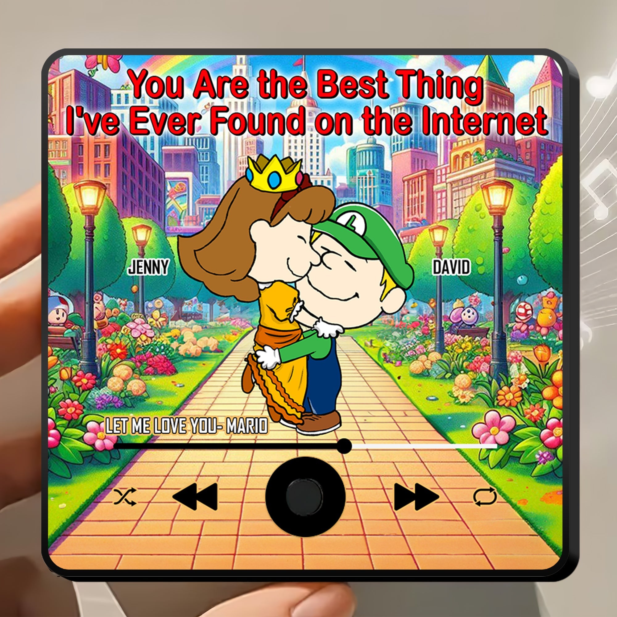 Celebrate your love with our Custom Music Fridge Magnet, featuring a whimsical design and personal touches. This unique gift showcases your special bond with customizable names and a heartfelt message, 'You Are the Best Thing I’ve Ever Found on the Internet.' Perfect for anniversaries, weddings, or just because. Bring joy to your home and cherish your memories with a delightful piece of art for your fridge.
