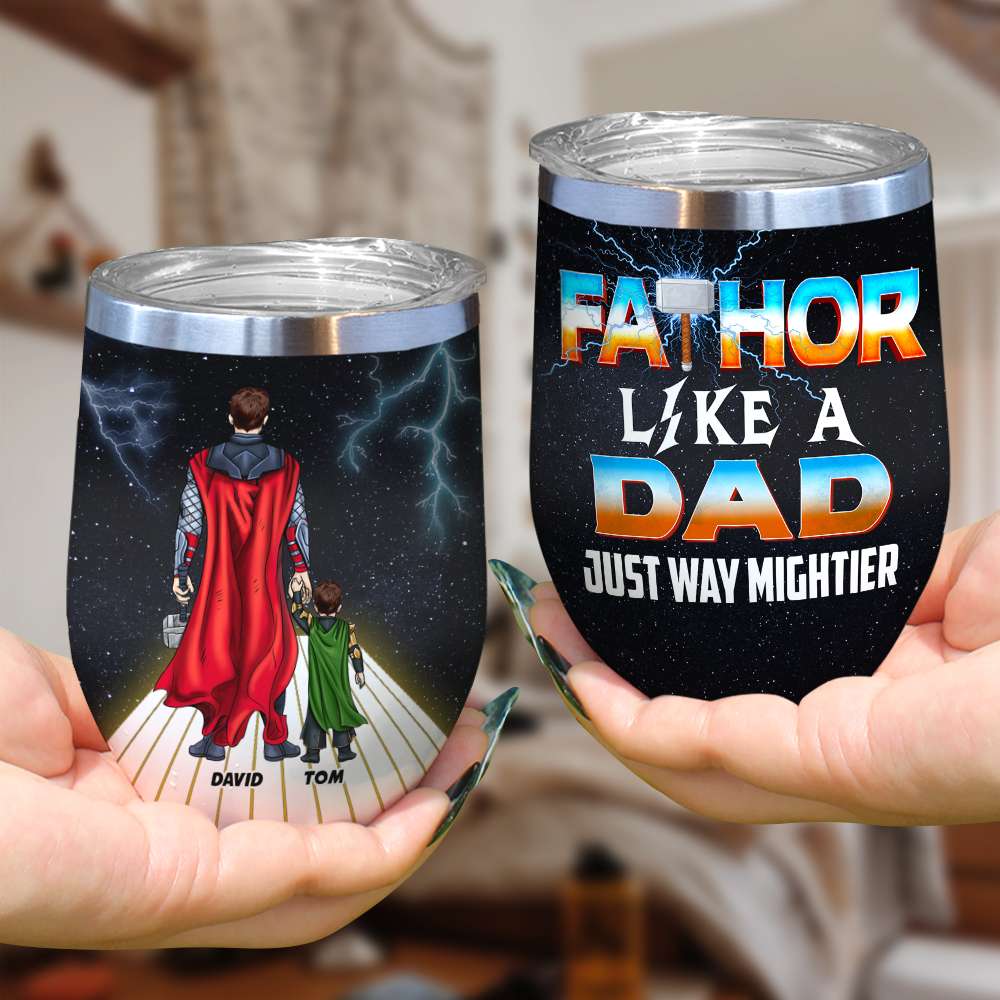 Celebrate the mighty bond between father and child with this Personalized Super Dad & Kid Wine Tumbler. Featuring a striking design inspired by pop culture heroes, this tumbler can be customized with your names. Perfect for Father's Day, birthdays, or any special occasion.