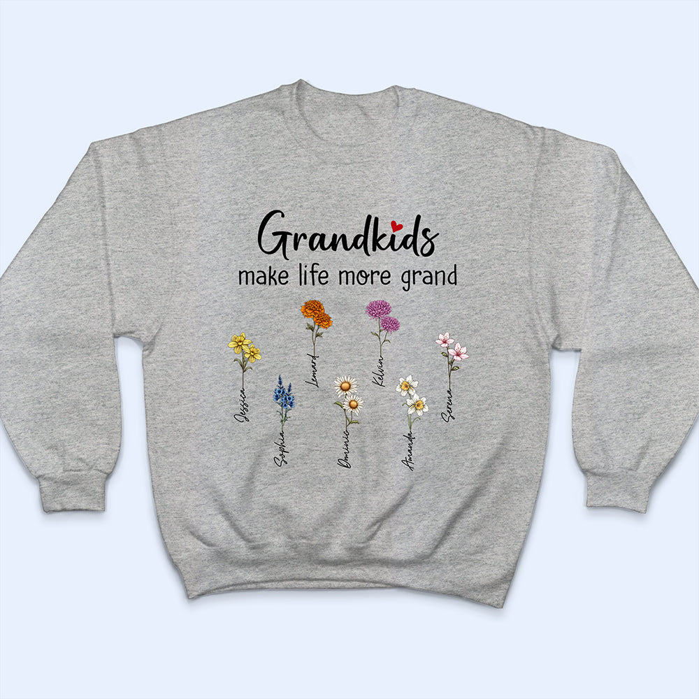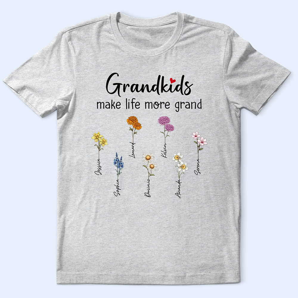 The Grandkids Make Life More Grand - Personalized T Shirt is the perfect way to celebrate the love and joy that grandkids bring into a grandmother's life. Featuring a heartwarming message, this unique t-shirt is an awesome gift for any grandma who treasures the special bond she shares with her grandchildren. Add a personal touch by customizing it with names or a special message to make it even more meaningful.