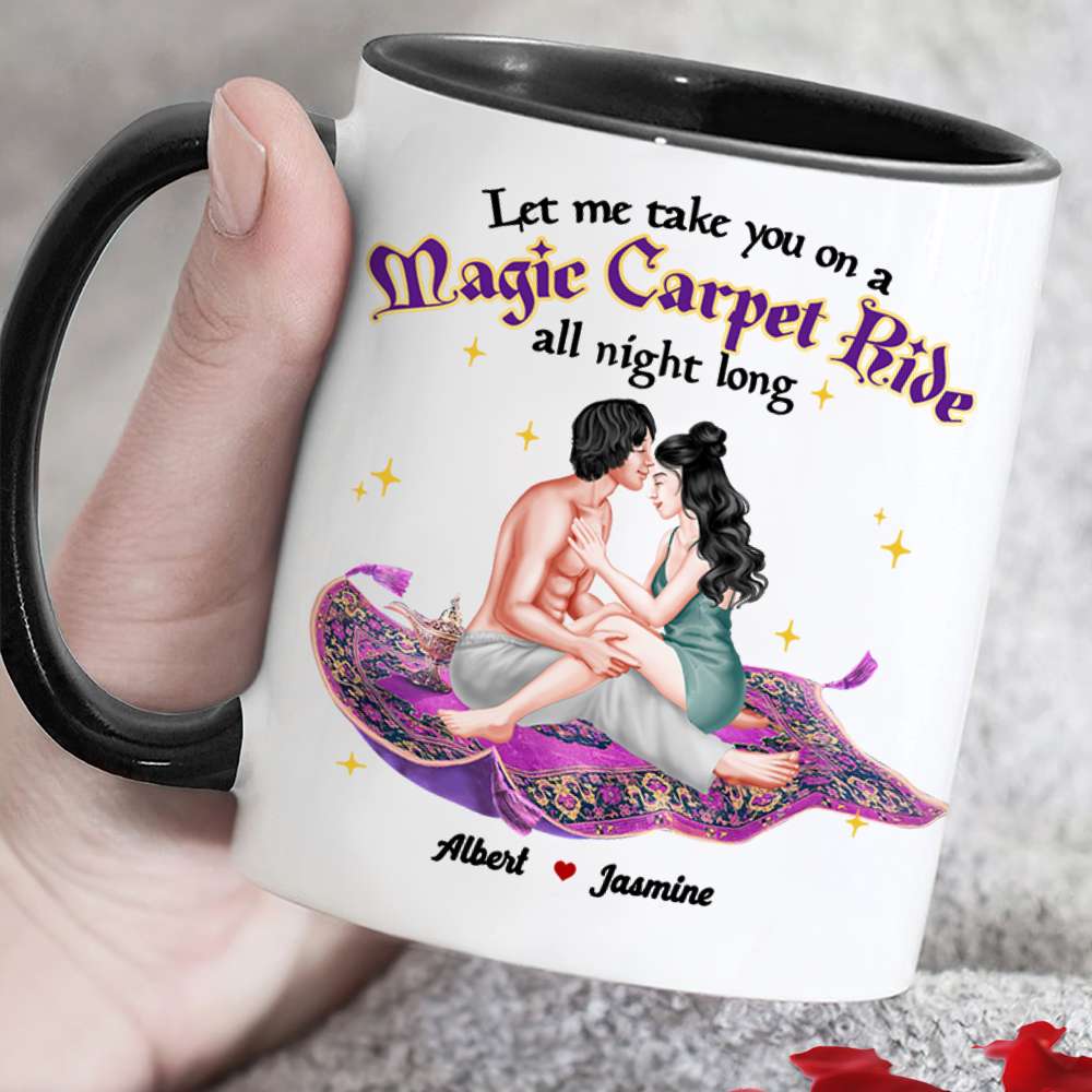 Surprise your loved one with our 'Magic Carpet Ride All Night Long' personalized couple mug. This unique and romantic gift features customizable names, making it the perfect keepsake for anniversaries, special occasions, or just because. Let your love story unfold with every sip!