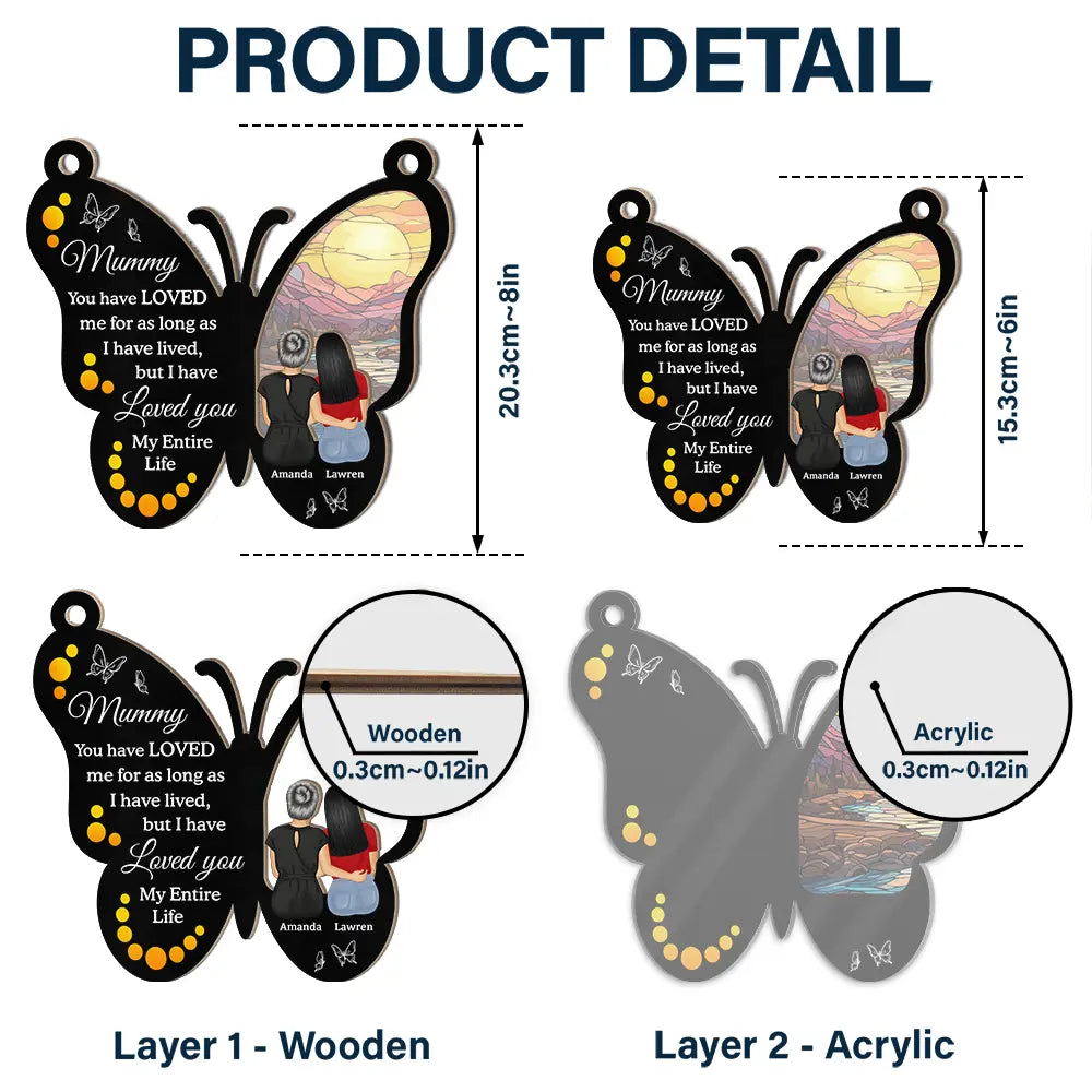 Celebrate the unbreakable bond between mothers and daughters with our 'My Entire Life' personalized window hanging suncatcher ornament. This beautifully designed piece features a heartfelt quote and customizable options to make it a unique gift. Perfect for Mother's Day, birthdays, or any special occasion, this ornament serves as a reminder of love that lasts a lifetime. Personalize it to convey your heartfelt emotions for your mom, grandma, or any special woman in your life.