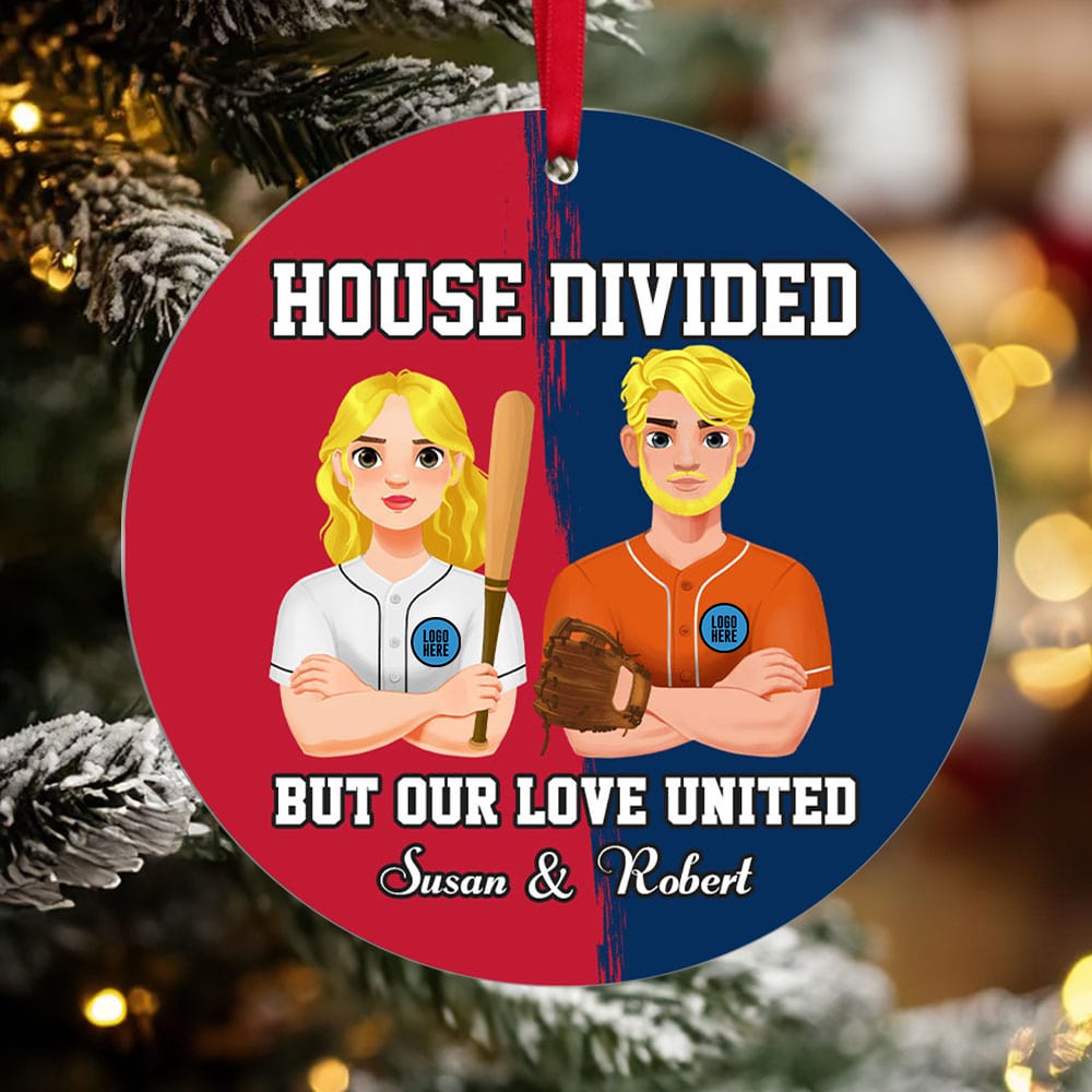 Celebrate the holiday spirit with our personalized Christmas ornament, perfect for baseball-loving couples. Featuring customizable names and a unique 'House Divided, But Our Love United' design, this ornament brings a playful touch to your festive decor. Ideal for families where baseball teams may differ but love remains strong.