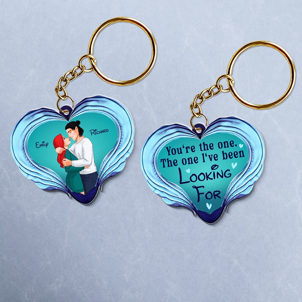 Celebrate your love with our heart-shaped personalized keychain, featuring your names and the heartfelt message, 'You're the one. The one I've been looking for.' Perfect for couples, this meaningful gift adds a personal touch to any occasion. Crafted with love, it's an ideal gift for anniversaries, Valentine's Day, or just to express your affection.