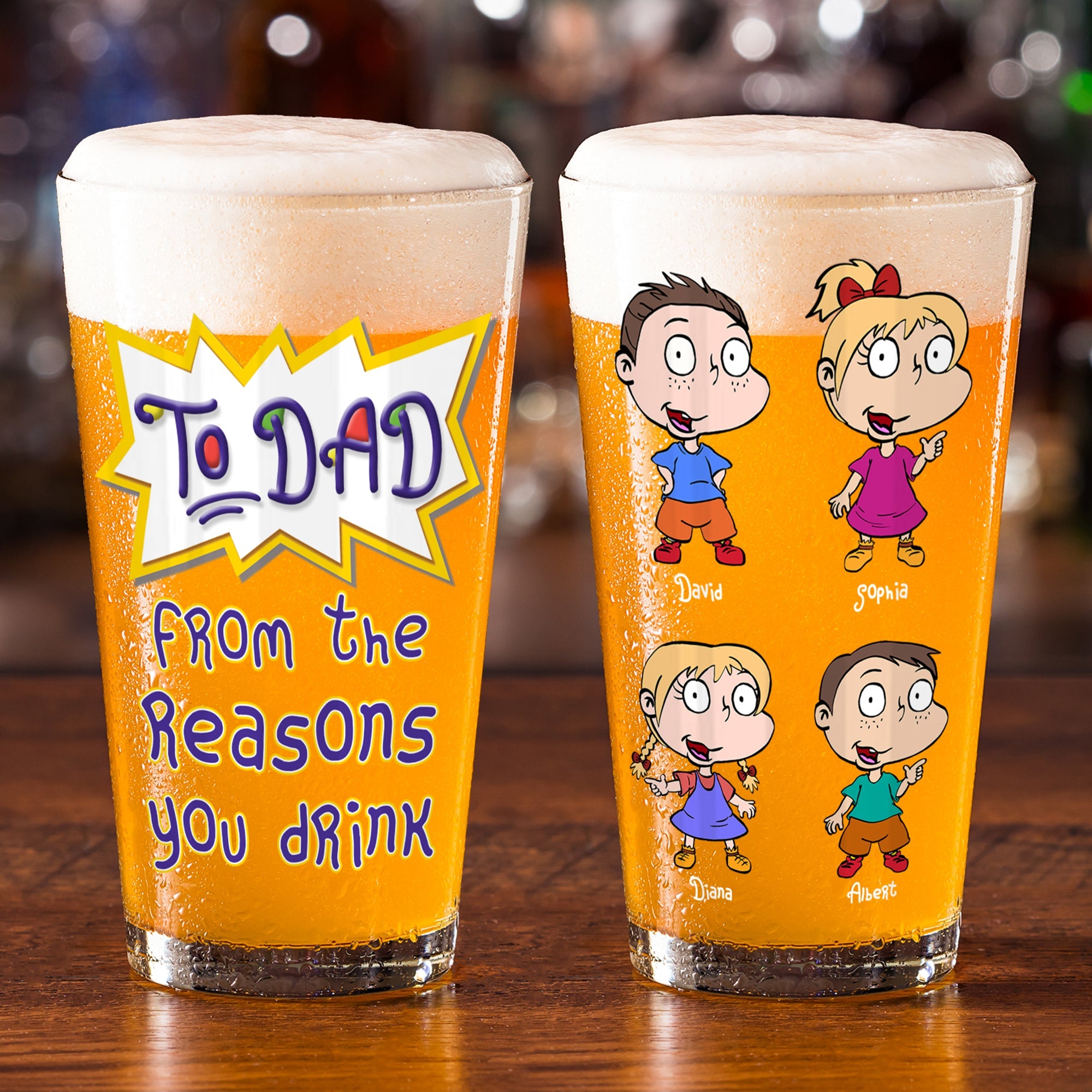 Celebrate Father's Day with our personalized beer glass, featuring a fun design that showcases the lovable chaos of family life. Customize with your children's names to create a heartfelt and humorous gift that Dad will cherish every time he enjoys his favorite brew.