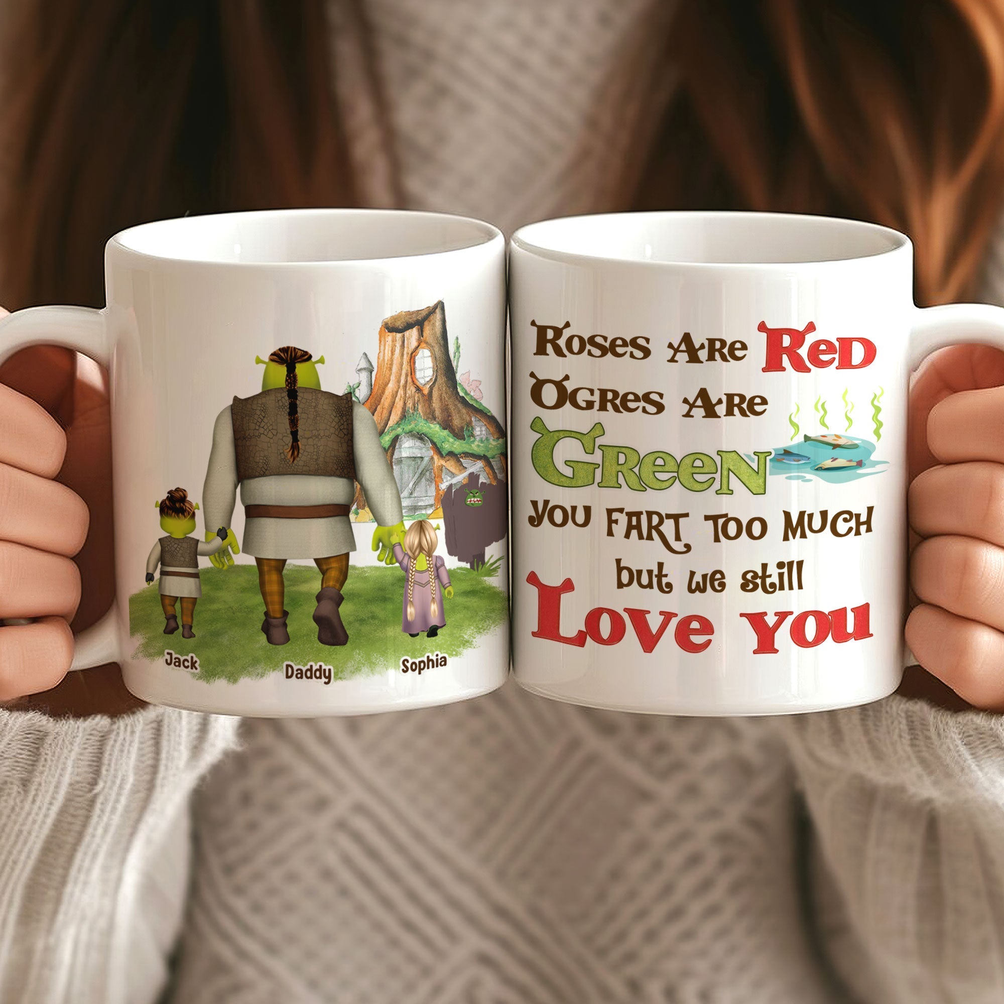 Surprise your dad with this personalized, humorous mug featuring a playful ogre-themed design. Perfect for Father's Day, this mug allows you to add custom names for a unique family twist. Bring joy and laughter to your morning coffee routine with our delightful, customizable gift that celebrates the fun side of fatherhood.