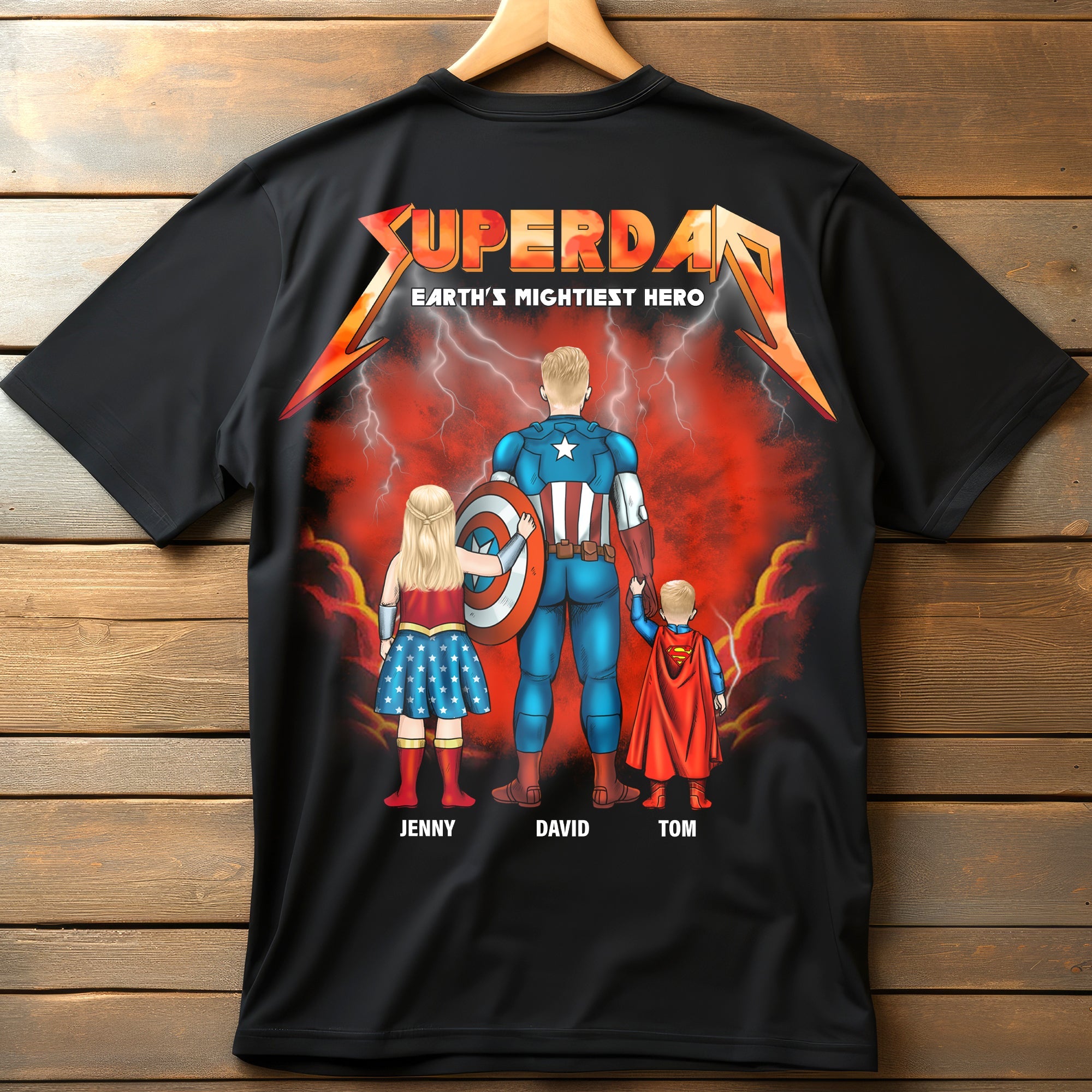 Celebrate the superhero in your life with our 'Super Dad' personalized shirt! This unique design features a powerful image of a father alongside his children, showcasing love and strength. Perfect for Fathers' Day, birthdays, or just to show appreciation, this shirt can be customized with names to make it truly special. Gift your superhero dad a shirt that reflects his heroic qualities!