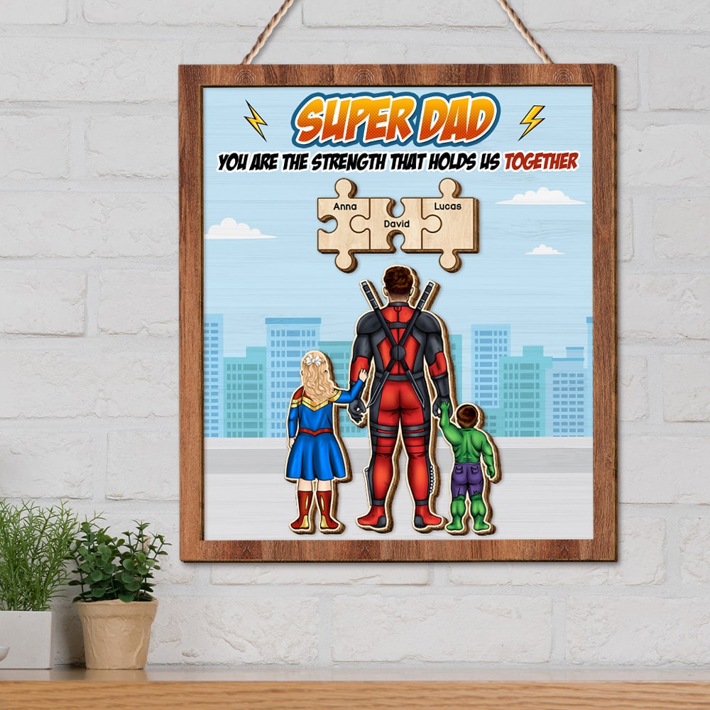 Celebrate Father's Day with this personalized Super Dad Wood Sign! Featuring a unique puzzle piece design, this custom gift showcases dad as the superhero he is. Include your own family names to create a meaningful and lasting tribute that the whole family will cherish.
