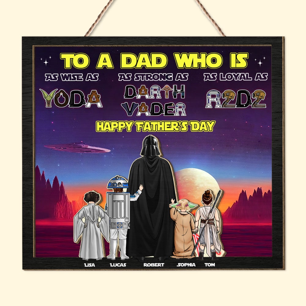 Celebrate your dad with a personalized wood sign that combines iconic characters and heartfelt sentiments. This Father’s Day, show your dad he's as wise as Yoda, as strong as Darth Vader, and as loyal as R2D2 with a unique and thoughtful gift. Customize with names and make it a standout present to treasure forever.
