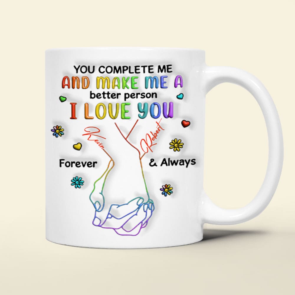 Celebrate your love with our Personalized LGBT Couple Coffee Mug featuring the heartfelt message, 'You Complete Me and Make Me a Better Person. I Love You' in vibrant colors. This unique mug allows for personalization, making it a meaningful gift for anniversaries, birthdays, or just to show appreciation. Perfect for coffee lovers, this mug is not just a functional item, but a token of love that brings joy to any occasion.