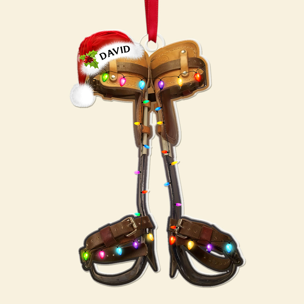 Celebrate the holidays with a unique touch! This Personalized Lineman Christmas Ornament features detailed climbing spikes adorned with festive lights. Perfect for linemen, this ornament can be customized with a name, adding a personal touch to your holiday decor.