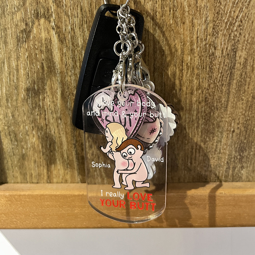 Surprise your special someone with this unique personalized keychain designed for couples. Featuring playful and loving artwork, this keychain showcases an affectionate message: 'I love your body and mind & your butt.' Ideal as a meaningful gift for anniversaries, birthdays, or just because, it serves as a daily reminder of love and connection. Customizable with names, this keychain not only makes a statement but also brings joy to both the giver and the recipient.