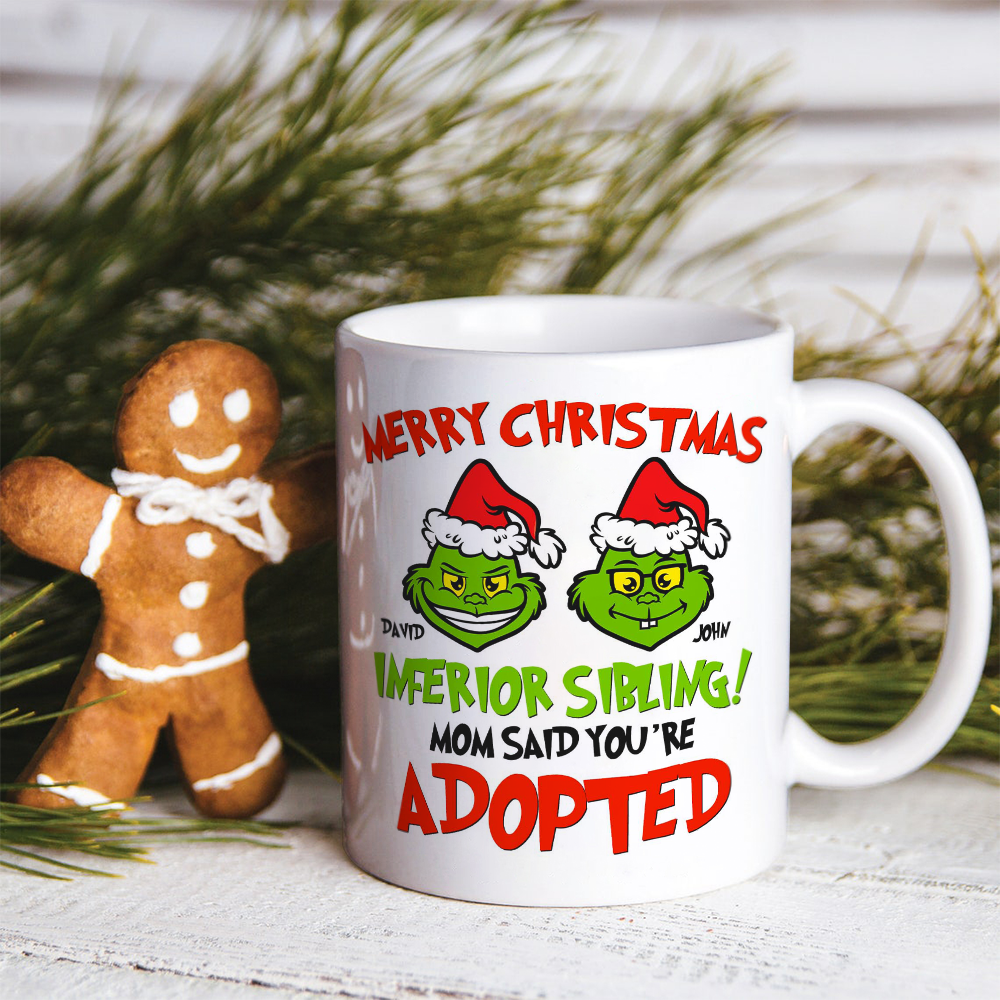 Celebrate the holiday cheer with our Funny Sibling Christmas Mug! Featuring a playful Grinch design with customizable names, this mug is perfect for siblings who love a good laugh. A unique and personal gift for Christmas, guaranteed to bring smiles and giggles.