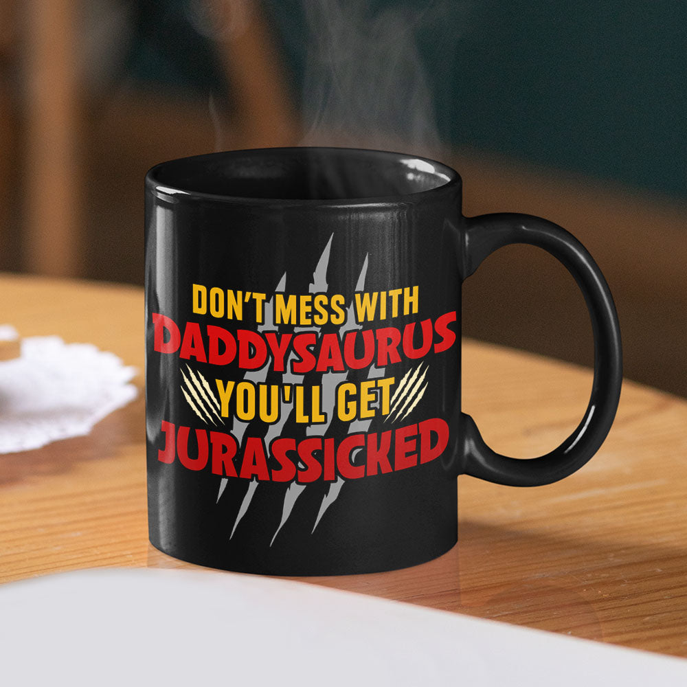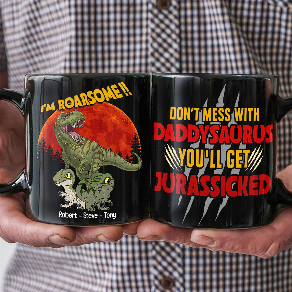 Celebrate the fierce love of a dad with our Roaring Daddysaurus Personalized Black Mug. This T-Rex themed mug features customizable names and a unique design perfect for any dinosaur-loving dad. Ideal for Father's Day, birthdays, or a delightful everyday surprise!
